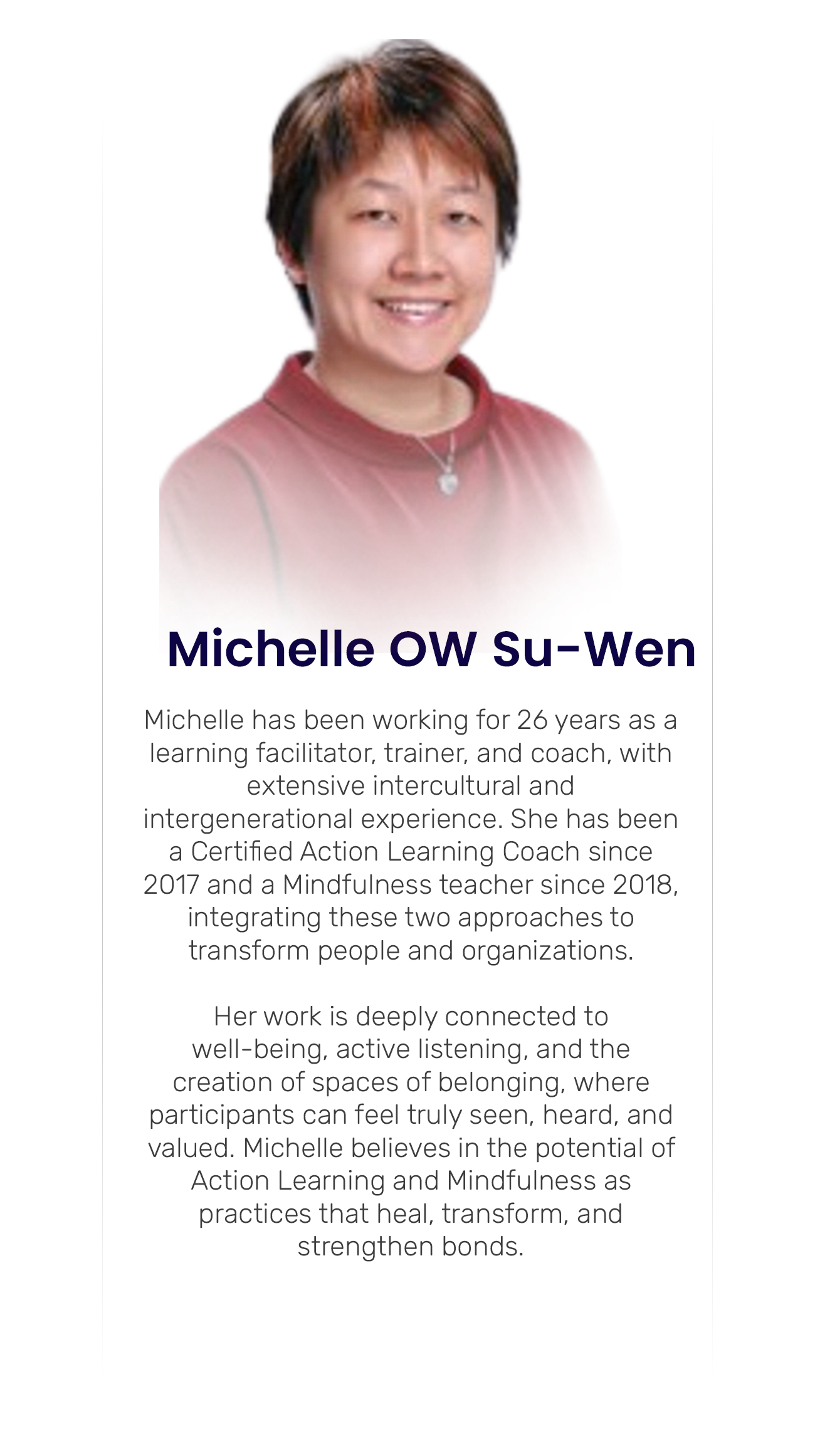 14h30 - 15h30 | Mindfulness in Action Learning: How to cultivate presence, attention and acceptance individually and collectively Michele OW |